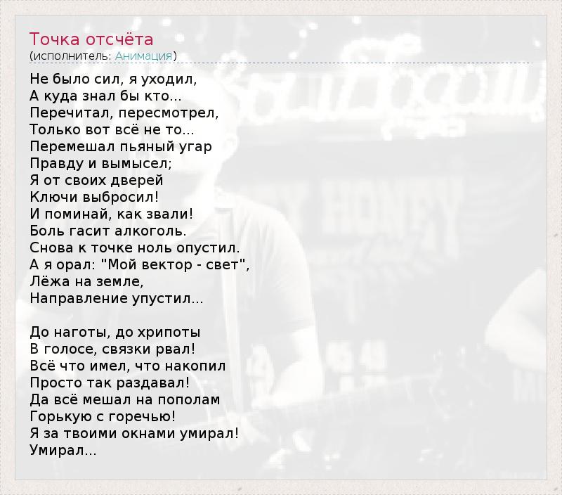 Не было сил, я уходил, А куда знал бы кто... Перечитал, пересмотрел, Только вот всё не то... Перемешал пьяный угар Правду и вымысел; Я от своих дверей Ключи выбросил! И поминай, как звали! Боль гасит алкоголь. Снова к точке ноль опустил. А я орал: "Мой вектор - свет", Лёжа на земле, Направление упустил... До наготы, до хрипоты В голосе, связки рвал! Всё что имел, что накопил Просто так раздавал! Да всё мешал на пополам Горькую с горечью! Я за твоими окнами умирал! Умирал...
