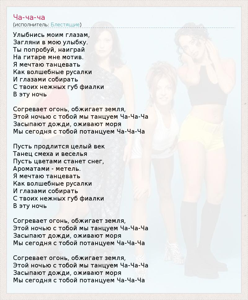 Улыбнись моим глазам, Загляни в мою улыбку. Ты попробуй, наиграй На гитаре мне мотив. Я мечтаю танцевать Как волшебные русалки И глазами собирать С твоих нежных губ фиалки В эту ночь Согревает огонь, обжигает земля, Этой ночью с тобой мы танцуем Ча-Ча-Ча Засыпают дожди, оживают моря Мы сегодня с тобой потанцуем Ча-Ча-Ча Пусть продлится целый век Танец смеха и веселья Пусть цветами станет снег, Ароматами - метель. Я мечтаю танцевать Как волшебные русалки И глазами собирать С твоих нежных губ фиалки В эту ночь Согревает огонь, обжигает земля, Этой ночью с тобой мы танцуем Ча-Ча-Ча Засыпают дожди, оживают моря Мы сегодня с тобой потанцуем Ча-Ча-Ча Согревает огонь, обжигает земля, Этой ночью с тобой мы танцуем Ча-Ча-Ча Засыпают дожди, оживают моря Мы сегодня с тобой потанцуем Ча-Ча-Ча