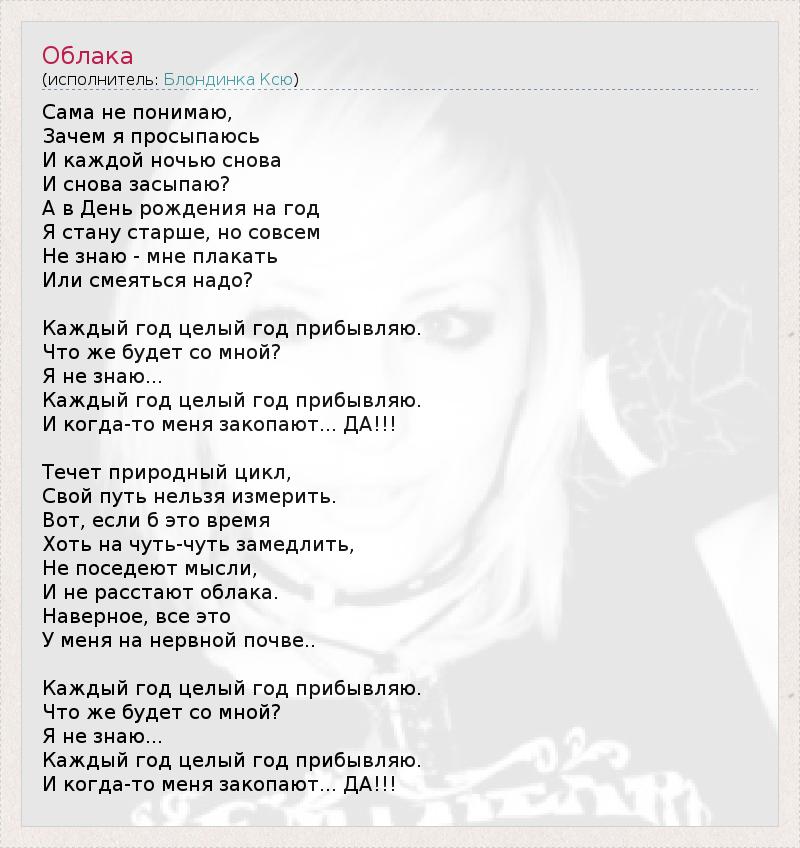 Это интересно:Блондинка КсЮ (настоящее имя — Ксения Сидорина) - cекс-символ рока (по оценке журнала "Роллинг Стоун") и одна из ведущих певиц отечественной рок-сцены. Блондинка КсЮ выпускает свой новый, второй по счету альбом – «Время все разрушает». КсЮ родилась 21 августа, 1982 года в городе Горьком в семье архитекторов. Когда ей исполнилось 2 года, они всей семьей переехали на землю Тульскую, на... продолжение