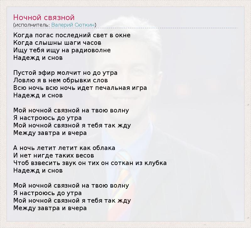 Когда погас последний свет в окне Когда слышны шаги часов Ищу тебя ищу на радиоволне Надежд и снов Пустой эфир молчит но до утра Ловлю я в нем обрывки слов Всю ночь всю ночь идет печальная игра Надежд и снов Мой ночной связной на твою волну Я настроюсь до утра Мой ночной связной я тебя так жду Между завтра и вчера А ночь летит летит как облака И нет нигде таких весов Чтоб взвесить звук он тих он соткан из клубка Надежд и снов Мой ночной связной на твою волну Я настроюсь до утра Мой ночной связной я тебя так жду Между завтра и вчера