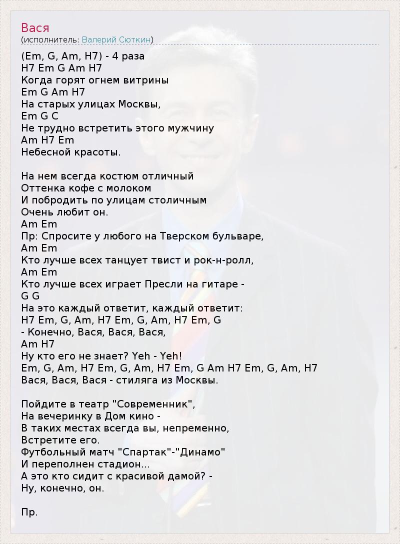 (Em, G, Am, H7) - 4 раза H7 Em G Am H7 Когда горят огнем витрины Em G Am H7 На старых улицах Москвы, Em G C Не трудно встретить этого мужчину Am H7 Em Небесной красоты. На нем всегда костюм отличный Оттенка кофе с молоком И побродить по улицам столичным Очень любит он. Am Em Пр: Спросите у любого на Тверском бульваре, Am Em Кто лучше всех танцует твист и рок-н-ролл, Am Em Кто лучше всех играет Пресли на гитаре - G G На это каждый ответит, каждый ответит: H7 Em, G, Am, H7 Em, G, Am, H7 Em, G - Конечно, Вася, Вася, Вася, Am H7 Ну кто его не знает? Yeh - Yeh! Em, G, Am, H7 Em, G, Am, H7 Em, G Am H7 Em, G, Am, H7 Вася, Вася, Вася - стиляга из Москвы. Пойдите в театр "Современник", На вечеринку в Дом кино - В таких местах всегда вы, непременно, Встретите его. Футбольный матч "Спартак"-"Динамо" И переполнен стадион... А это кто сидит с красивой дамой? - Ну, конечно, он. Пр.