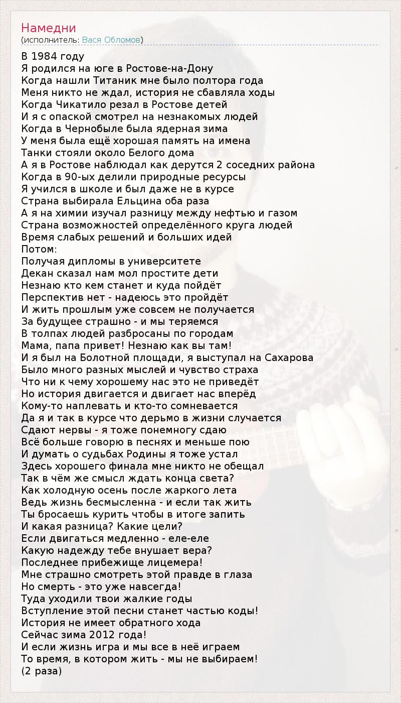 Это интересно:Вася Обломов — сайд-проект вокалиста и идейного вдохновителя группы «Чебоза» Василия Гончарова. В мае 2010 года Василий Гончаров под псевдонимом Вася Обломов опубликовал в интернете мультипликационный видеоклип на песню «Магадан», мгновенно ставший популярным,... продолжение