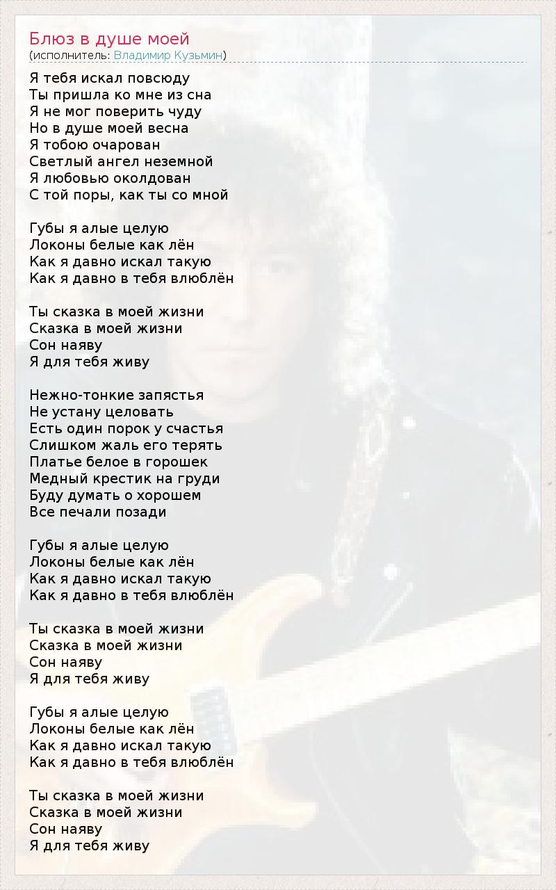 Это интересно:Владимир Кузьмин родился 31 мая 1955 г. в Москве в семье морского офицера и учительницы иностранных языков. В школе - отличник, с детства увлекался музыкой, учился в музыкальной школе по классу скрипки, свою первую песню написал в 6 лет. Самостоятельно освоив гитару, еще в школе начал выступать в различных самодеятельных коллективах. Учась в шестом классе, он организовал свою первую рок-группу,... продолжение