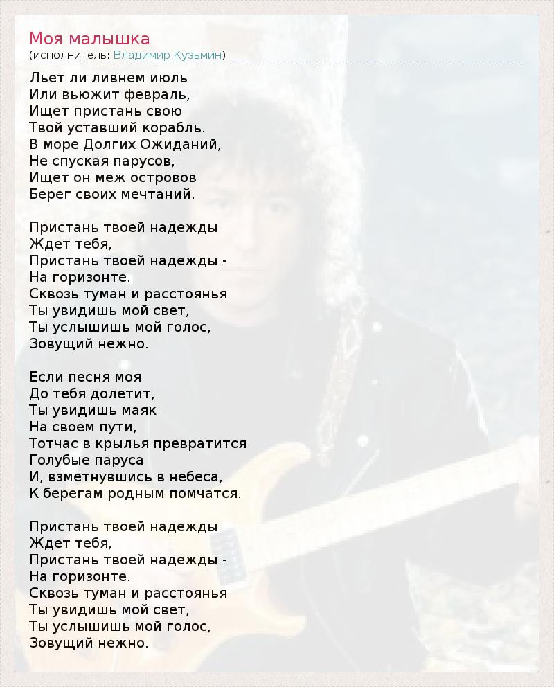 Это интересно:Владимир Кузьмин родился 31 мая 1955 г. в Москве в семье морского офицера и учительницы иностранных языков. В школе - отличник, с детства увлекался музыкой, учился в музыкальной школе по классу скрипки, свою первую песню написал в 6 лет. Самостоятельно освоив гитару, еще в школе начал выступать в различных самодеятельных коллективах. Учась в шестом классе, он организовал свою первую рок-группу,... продолжение