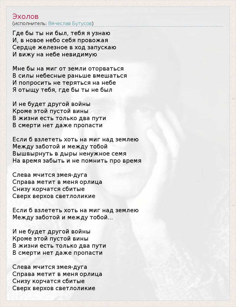 Это интересно:Вячеслав Геннадьевич Бутусов — русский рок-музыкант, лидер групп Nautilus Pompilius и Ю-Питер.Родился 15 октября 1961 года в поселке Бугач Красноярского края. Из-за профессии отца семья часто переезжала с места на место, поэтому до 9 класса Вячеслав учился и жил в различных сибирских городах. В 9 классе переезжает в Свердловск(сейчас Екатеринбург),... продолжение