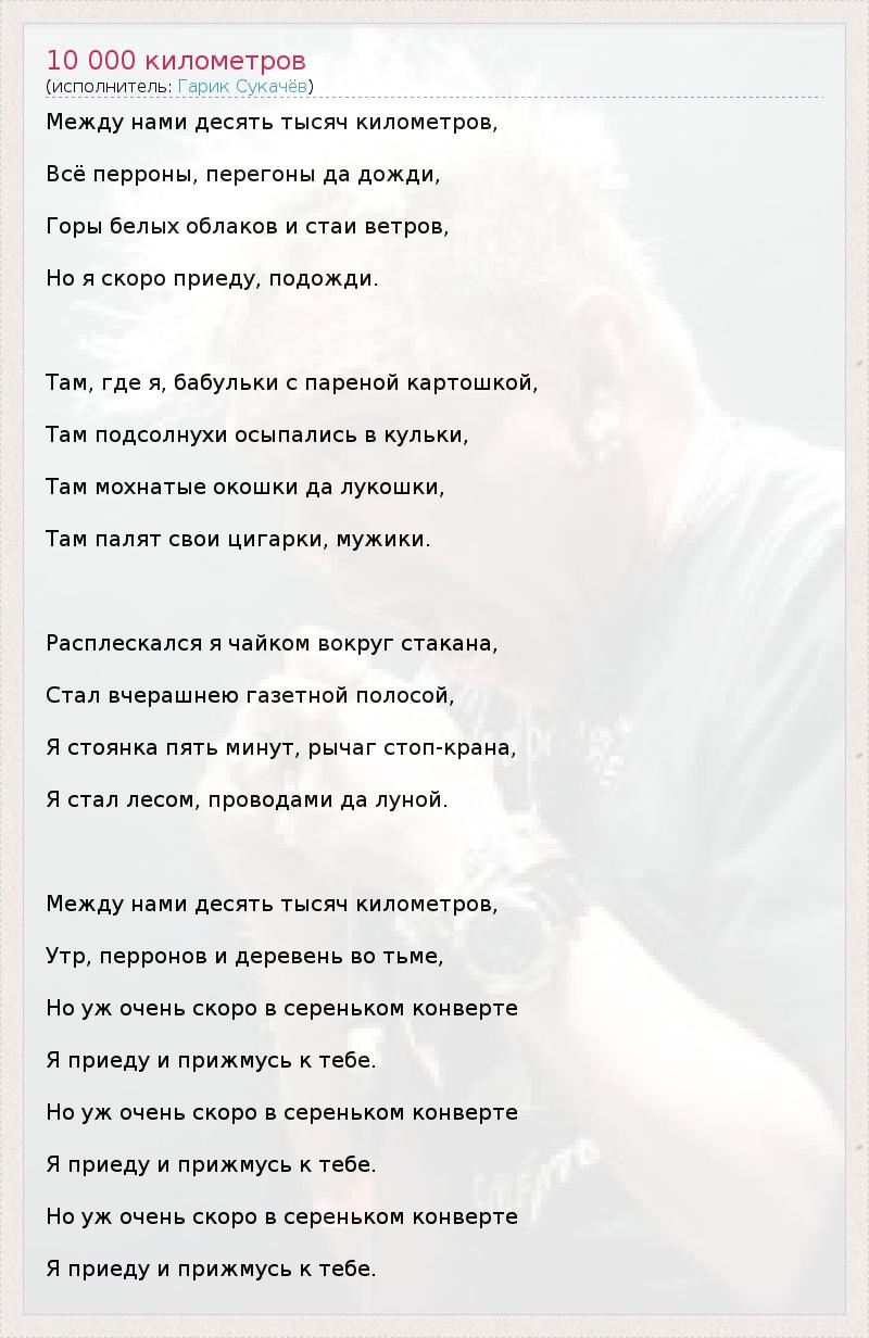 Между нами десять тысяч километров, Всё перроны, перегоны да дожди, Горы белых облаков и стаи ветров, Но я скоро приеду, подожди. Там, где я, бабульки с пареной картошкой, Там подсолнухи осыпались в кульки, Там мохнатые окошки да лукошки, Там палят свои цигарки, мужики. Расплескался я чайком вокруг стакана, Стал вчерашнею газетной полосой, Я стоянка пять минут, рычаг стоп-крана, Я стал лесом, проводами да луной. Между нами десять тысяч километров, Утр, перронов и деревень во тьме, Но уж очень скоро в сереньком конверте Я приеду и прижмусь к тебе. Но уж очень скоро в сереньком конверте Я приеду и прижмусь к тебе. Но уж очень скоро в сереньком конверте Я приеду и прижмусь к тебе.