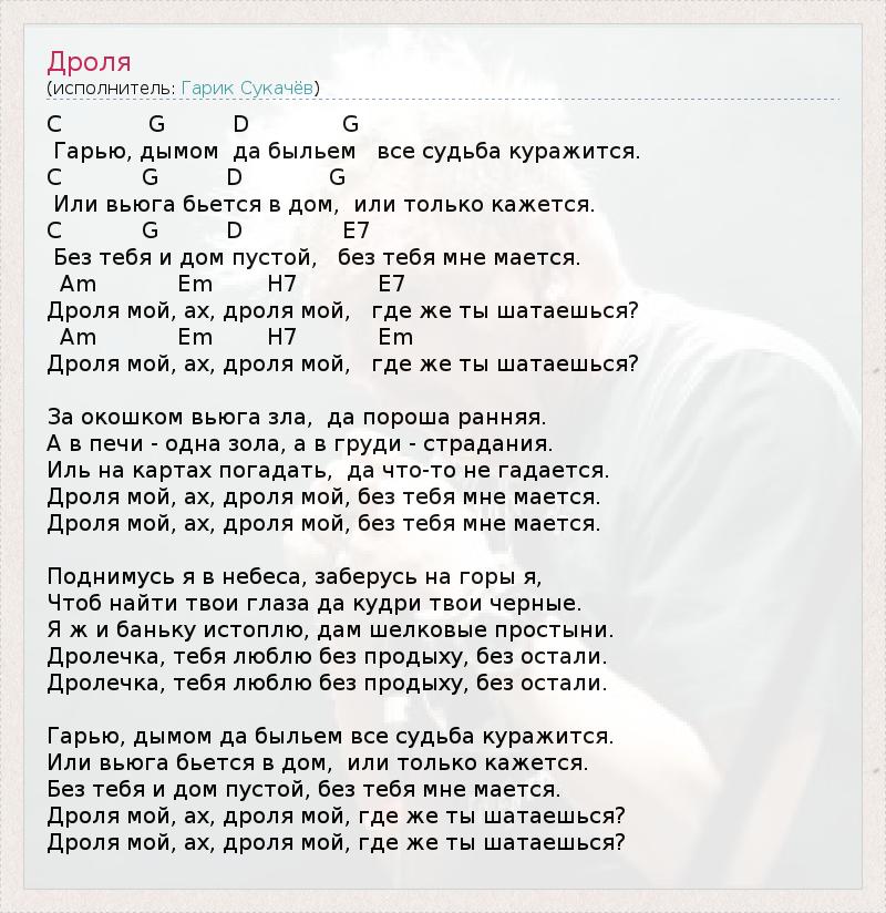 C G D G Гарью, дымом да быльем все судьба куражится. C G D G Или вьюга бьется в дом, или только кажется. C G D E7 Без тебя и дом пустой, без тебя мне мается. Am Em H7 E7 Дроля мой, ах, дроля мой, где же ты шатаешься? Am Em H7 Em Дроля мой, ах, дроля мой, где же ты шатаешься? За окошком вьюга зла, да пороша ранняя. А в печи - одна зола, а в груди - страдания. Иль на картах погадать, да что-то не гадается. Дроля мой, ах, дроля мой, без тебя мне мается. Дроля мой, ах, дроля мой, без тебя мне мается. Поднимусь я в небеса, заберусь на горы я, Чтоб найти твои глаза да кудри твои черные. Я ж и баньку истоплю, дам шелковые простыни. Дролечка, тебя люблю без продыху, без остали. Дролечка, тебя люблю без продыху, без остали. Гарью, дымом да быльем все судьба куражится. Или вьюга бьется в дом, или только кажется. Без тебя и дом пустой, без тебя мне мается. Дроля мой, ах, дроля мой, где же ты шатаешься? Дроля мой, ах, дроля мой, где же ты шатаешься?