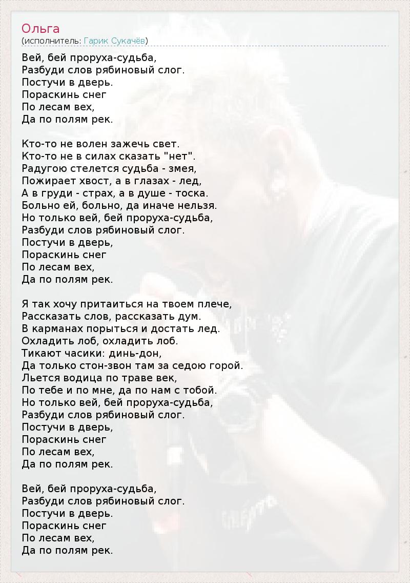 Вей, бей проруха-судьба, Разбуди слов рябиновый слог. Постучи в дверь. Пораскинь снег По лесам вех, Да по полям рек. Кто-то не волен зажечь свет. Кто-то не в силах сказать "нет". Радугою стелется судьба - змея, Пожирает хвост, а в глазах - лед, А в груди - страх, а в душе - тоска. Больно ей, больно, да иначе нельзя. Но только вей, бей проруха-судьба, Разбуди слов рябиновый слог. Постучи в дверь, Пораскинь снег По лесам вех, Да по полям рек. Я так хочу притаиться на твоем плече, Рассказать слов, рассказать дум. В карманах порыться и достать лед. Охладить лоб, охладить лоб. Тикают часики: динь-дон, Да только стон-звон там за седою горой. Льется водица по траве век, По тебе и по мне, да по нам с тобой. Но только вей, бей проруха-судьба, Разбуди слов рябиновый слог. Постучи в дверь, Пораскинь снег По лесам вех, Да по полям рек. Вей, бей проруха-судьба, Разбуди слов рябиновый слог. Постучи в дверь. Пораскинь снег По лесам вех, Да по полям рек. Гарик Сукачев - Ольга http://megalyrics.ru/lyric/%D0%B3%D0%B0%D1%80%D0%B8%D0%BA-%D1%81%D1%83%D0%BA%D0%B0%D1%87%D0%B5%D0%B2/%D0%BE%D0%BB%D1%8C%D0%B3%D0%B0.htm#ixzz26jyrmCdN