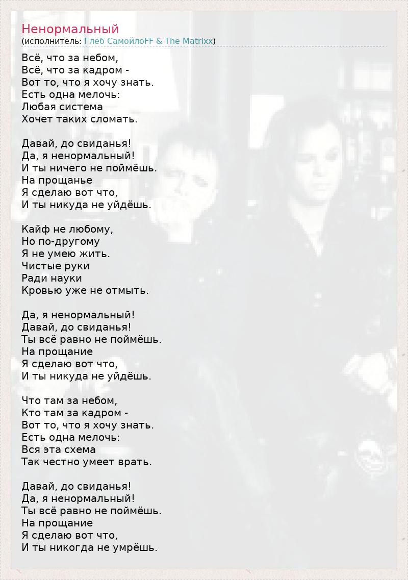 Всё, что за небом, Всё, что за кадром - Вот то, что я хочу знать. Есть одна мелочь: Любая система Хочет таких сломать. Давай, до свиданья! Да, я ненормальный! И ты ничего не поймёшь. На прощанье Я сделаю вот что, И ты никуда не уйдёшь. Кайф не любому, Но по-другому Я не умею жить. Чистые руки Ради науки Кровью уже не отмыть. Да, я ненормальный! Давай, до свиданья! Ты всё равно не поймёшь. На прощание Я сделаю вот что, И ты никуда не уйдёшь. Что там за небом, Кто там за кадром - Вот то, что я хочу знать. Есть одна мелочь: Вся эта схема Так честно умеет врать. Давай, до свиданья! Да, я ненормальный! Ты всё равно не поймёшь. На прощание Я сделаю вот что, И ты никогда не умрёшь.