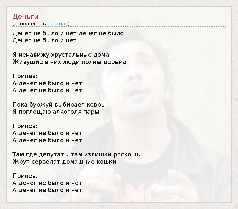 Денег не было и нет денег не было Денег не было и нет Я ненавижу хрустальные дома Живущие в них люди полны дерьма Припев: А денег не было и нет А денег не было и нет Пока буржуй выбирает ковры Я поглощаю алкоголя пары Припев: А денег не было и нет А денег не было и нет Там где депутаты там излишки роскошь Жрут сервелат домашние кошки Припев: А денег не было и нет А денег не было и нет