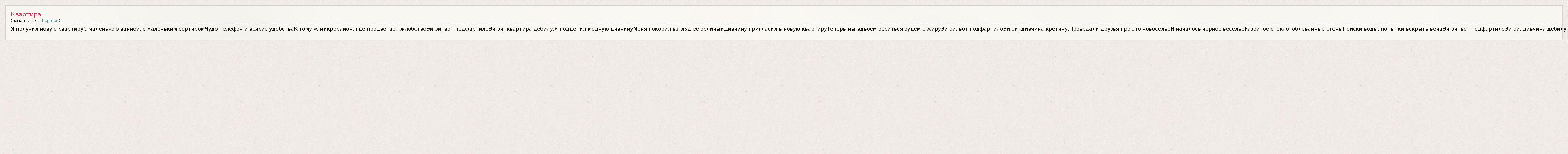 Я получил новую квартируС маленькою ванной, с маленьким сортиромЧудо-телефон и всякие удобстваК тому ж микрорайон, где процветает жлобствоЭй-эй, вот подфартилоЭй-эй, квартира дебилу.Я подцепил модную дивчинуМеня покорил взгляд её ослиныйДивчину пригласил в новую квартируТеперь мы вдвоём беситься будем с жируЭй-эй, вот подфартилоЭй-эй, дивчина кретину.Проведали друзья про это новосельеИ началось чёрное весельеРазбитое стекло, облёванные стеныПоиски воды, попытки вскрыть венаЭй-эй, вот подфартилоЭй-эй, дивчина дебилу.