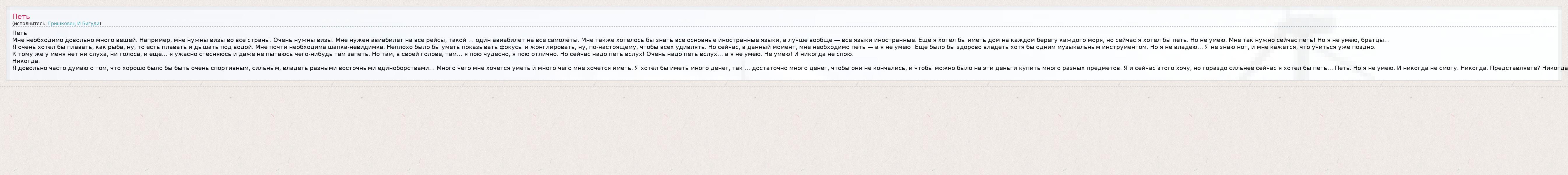 Петь Мне необходимо довольно много вещей. Например, мне нужны визы во все страны. Очень нужны визы. Мне нужен авиабилет на все рейсы, такой … один авиабилет на все самолёты. Мне также хотелось бы знать все основные иностранные языки, а лучше вообще — все языки иностранные. Ещё я хотел бы иметь дом на каждом берегу каждого моря, но сейчас я хотел бы петь. Но не умею. Мне так нужно сейчас петь! Но я не умею, братцы… Я очень хотел бы плавать, как рыба, ну, то есть плавать и дышать под водой. Мне почти необходима шапка-невидимка. Неплохо было бы уметь показывать фокусы и жонглировать, ну, по-настоящему, чтобы всех удивлять. Но сейчас, в данный момент, мне необходимо петь — а я не умею! Еще было бы здорово владеть хотя бы одним музыкальным инструментом. Но я не владею… Я не знаю нот, и мне кажется, что учиться уже поздно. К тому же у меня нет ни слуха, ни голоса, и ещё… я ужасно стесняюсь и даже не пытаюсь чего-нибудь там запеть. Но там, в своей голове, там… я пою чудесно, я пою отлично. Но сейчас надо петь вслух! Очень надо петь вслух… а я не умею. Не умею! И никогда не спою. Никогда. Я довольно часто думаю о том, что хорошо было бы быть очень спортивным, сильным, владеть разными восточными единоборствами… Много чего мне хочется уметь и много чего мне хочется иметь. Я хотел бы иметь много денег, так … достаточно много денег, чтобы они не кончались, и чтобы можно было на эти деньги купить много разных предметов. Я и сейчас этого хочу, но гораздо сильнее сейчас я хотел бы петь… Петь. Но я не умею. И никогда не смогу. Никогда. Представляете? Никогда