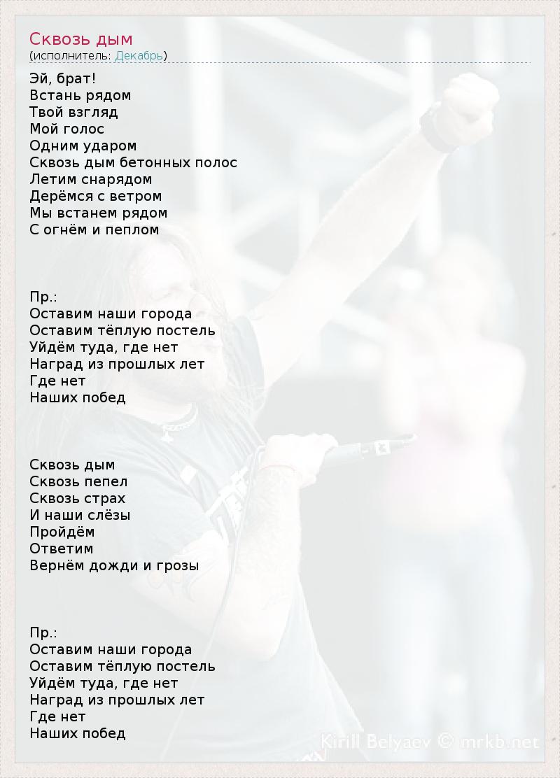 Эй, брат! Встань рядом Твой взгляд Мой голос Одним ударом Сквозь дым бетонных полос Летим снарядом Дерёмся с ветром Мы встанем рядом С огнём и пеплом Пр.: Оставим наши города Оставим тёплую постель Уйдём туда, где нет Наград из прошлых лет Где нет Наших побед Сквозь дым Сквозь пепел Сквозь страх И наши слёзы Пройдём Ответим Вернём дожди и грозы Пр.: Оставим наши города Оставим тёплую постель Уйдём туда, где нет Наград из прошлых лет Где нет Наших побед