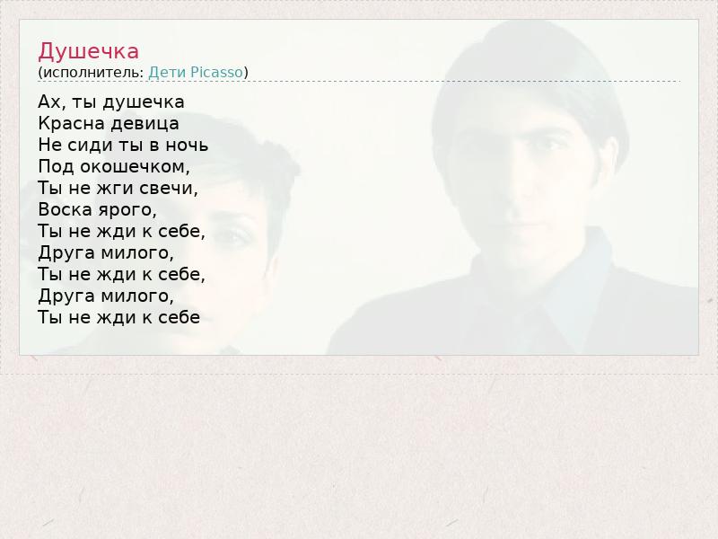 Ах, ты душечка Красна девица Не сиди ты в ночь Под окошечком, Ты не жги свечи, Воска ярого, Ты не жди к себе, Друга милого, Ты не жди к себе, Друга милого, Ты не жди к себе