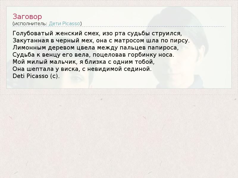 Голубоватый женский смех, изо рта судьбы струился, Закутанная в черный мех, она с матросом шла по пирсу. Лимонным деревом цвела между пальцев папироса, Судьба к венцу его вела, поцеловав горбинку носа. Мой милый мальчик, я близка с одним тобой, Она шептала у виска, с невидимой сединой. Deti Picasso (c).
