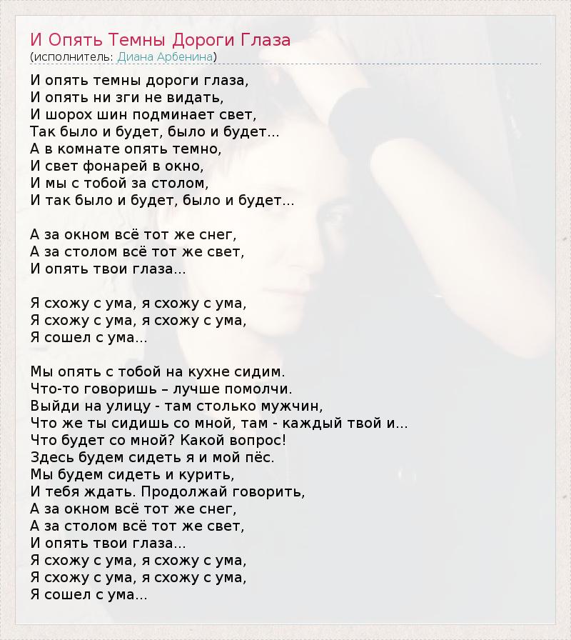 ГлавнаяИсполнителиДиана АрбенинаИ Опять Темны Дороги Глаза
