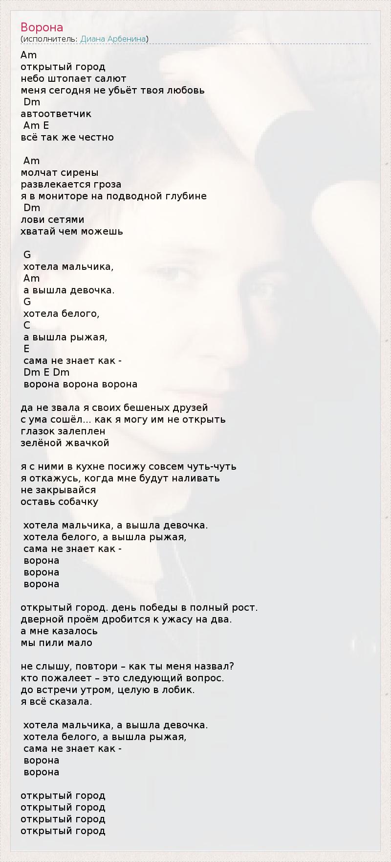 Это интересно:Диана Арбенина родилась в 1974 году в небольшом белорусском городе Воложин, что на границе с Польшей. А чуть позже родители-журналисты увезли трехлетнюю Диану на Крайний Север России: будучи увлеченными своей профессией, они не сидели на месте, переезжая в поселки Чукотки и Колымы. Там Диана получала как общее, так и музыкальное образование.... продолжение