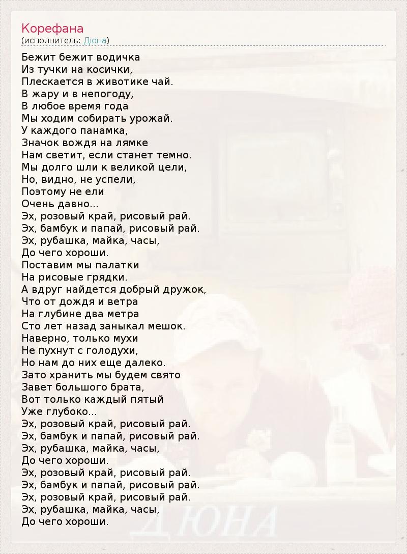 Бежит бежит водичка Из тучки на косички, Плескается в животике чай. В жару и в непогоду, В любое время года Мы ходим собирать урожай. У каждого панамка, Значок вождя на лямке Нам светит, если станет темно. Мы долго шли к великой цели, Но, видно, не успели, Поэтому не ели Очень давно... Эх, розовый край, рисовый рай. Эх, бамбук и папай, рисовый рай. Эх, рубашка, майка, часы, До чего хороши. Поставим мы палатки На рисовые грядки. А вдруг найдется добрый дружок, Что от дождя и ветра На глубине два метра Сто лет назад заныкал мешок. Наверно, только мухи Не пухнут с голодухи, Но нам до них еще далеко. Зато хранить мы будем свято Завет большого брата, Вот только каждый пятый Уже глубоко... Эх, розовый край, рисовый рай. Эх, бамбук и папай, рисовый рай. Эх, рубашка, майка, часы, До чего хороши. Эх, розовый край, рисовый рай. Эх, бамбук и папай, рисовый рай. Эх, розовый край, рисовый рай. Эх, рубашка, майка, часы, До чего хороши.