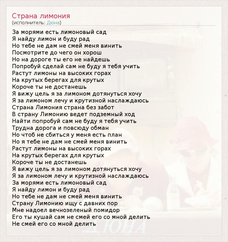 За морями есть лимоновый сад Я найду лимон и буду рад Но тебе не дам не смей меня винить Посмотрите до чего он хорош Но на дороге ты его не найдешь Попробуй сделай сам не буду я тебя учить Растут лимоны на высоких горах На крутых берегах для крутых Короче ты не достанешь Я вижу цель я за лимоном дотянуться хочу Я за лимоном лечу и крутизной наслаждаюсь Страна Лимония страна без забот В страну Лимонию ведет подземный ход Найти попробуй сам не буду я тебя учить Трудна дорога и повсюду обман Но чтоб не сбиться у меня есть план Но я тебе не дам не смей меня винить Растут лимоны на высоких горах На крутых берегах для крутых Короче ты не достанешь Я вижу цель я за лимоном дотянуться хочу Я за лимоном лечу и крутизной наслаждаюсь За морями есть лимоновый сад Я найду лимон и буду рад Но тебе не дам не смей меня винить Страну Лимонию ищу с давних пор Мне надоел вечнозеленый помидор Его ты кушай сам не смей его со мной делить Не смей его со мной делить