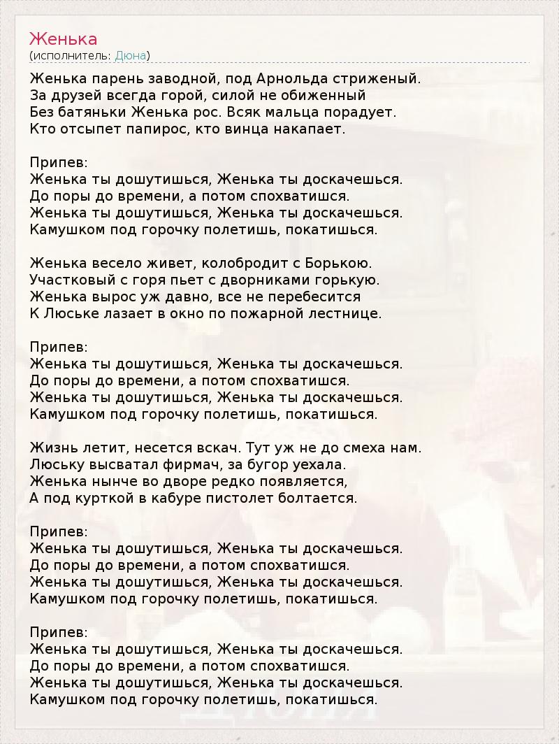 Женька парень заводной, под Арнольда стриженый. За друзей всегда горой, силой не обиженный Без батяньки Женька рос. Всяк мальца порадует. Кто отсыпет папирос, кто винца накапает. Припев: Женька ты дошутишься, Женька ты доскачешься. До поры до времени, а потом спохватишся. Женька ты дошутишься, Женька ты доскачешься. Камушком под горочку полетишь, покатишься. Женька весело живет, колобродит с Борькою. Участковый с горя пьет с дворниками горькую. Женька вырос уж давно, все не перебесится К Люське лазает в окно по пожарной лестнице. Припев: Женька ты дошутишься, Женька ты доскачешься. До поры до времени, а потом спохватишся. Женька ты дошутишься, Женька ты доскачешься. Камушком под горочку полетишь, покатишься. Жизнь летит, несется вскач. Тут уж не до смеха нам. Люську высватал фирмач, за бугор уехала. Женька нынче во дворе редко появляется, А под курткой в кабуре пистолет болтается. Припев: Женька ты дошутишься, Женька ты доскачешься. До поры до времени, а потом спохватишся. Женька ты дошутишься, Женька ты доскачешься. Камушком под горочку полетишь, покатишься. Припев: Женька ты дошутишься, Женька ты доскачешься. До поры до времени, а потом спохватишся. Женька ты дошутишься, Женька ты доскачешься. Камушком под горочку полетишь, покатишься.