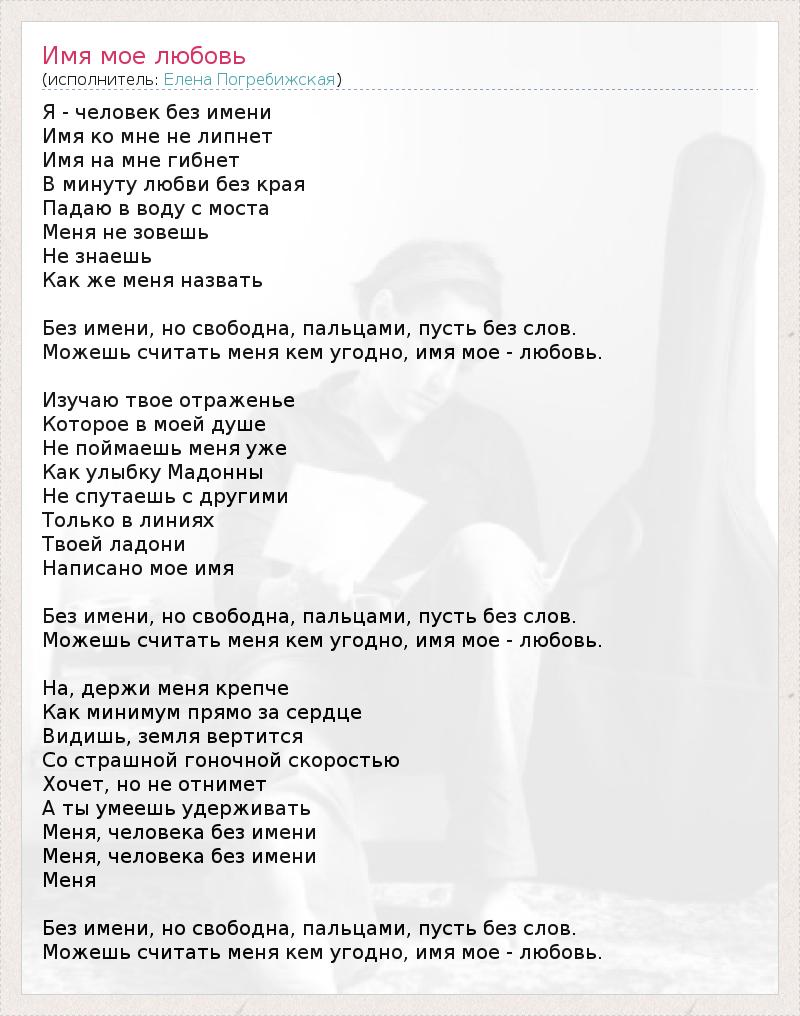 Я - человек без имени Имя ко мне не липнет Имя на мне гибнет В минуту любви без края Падаю в воду с моста Меня не зовешь Не знаешь Как же меня назвать Без имени, но свободна, пальцами, пусть без слов. Можешь считать меня кем угодно, имя мое - любовь. Изучаю твое отраженье Которое в моей душе Не поймаешь меня уже Как улыбку Мадонны Не спутаешь с другими Только в линиях Твоей ладони Написано мое имя Без имени, но свободна, пальцами, пусть без слов. Можешь считать меня кем угодно, имя мое - любовь. На, держи меня крепче Как минимум прямо за сердце Видишь, земля вертится Со страшной гоночной скоростью Хочет, но не отнимет А ты умеешь удерживать Меня, человека без имени Меня, человека без имени Меня Без имени, но свободна, пальцами, пусть без слов. Можешь считать меня кем угодно, имя мое - любовь.