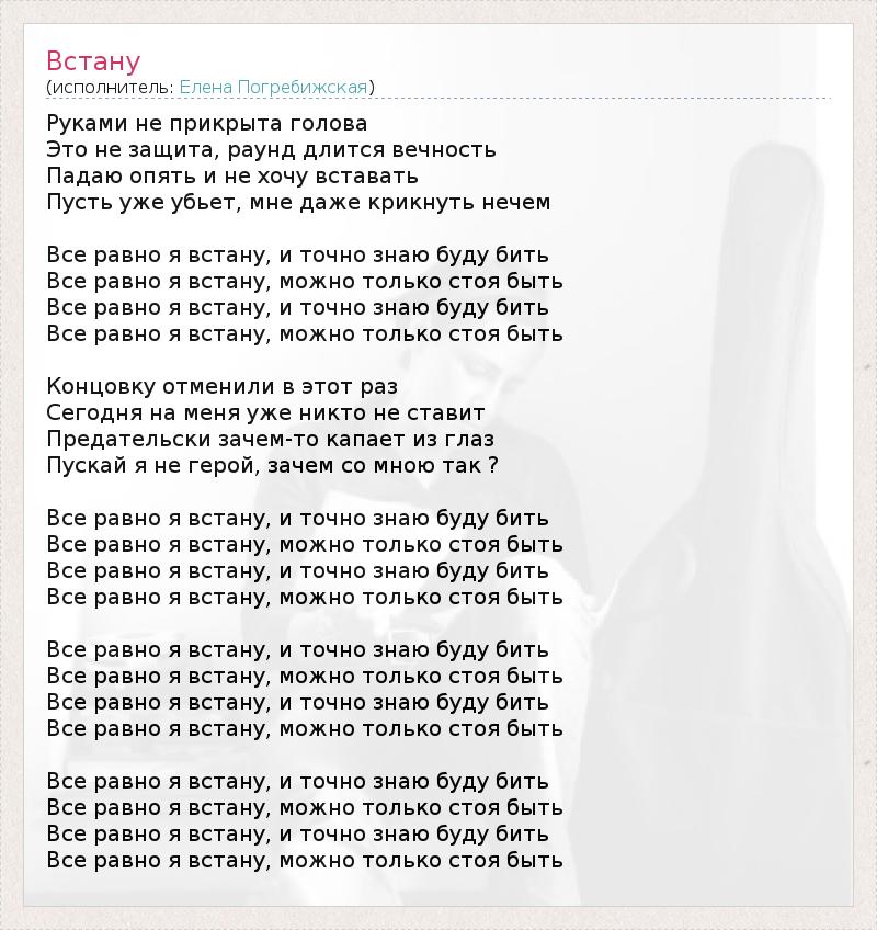Руками не прикрыта голова Это не защита, раунд длится вечность Падаю опять и не хочу вставать Пусть уже убьет, мне даже крикнуть нечем Все равно я встану, и точно знаю буду бить Все равно я встану, можно только стоя быть Все равно я встану, и точно знаю буду бить Все равно я встану, можно только стоя быть Концовку отменили в этот раз Сегодня на меня уже никто не ставит Предательски зачем-то капает из глаз Пускай я не герой, зачем со мною так ? Все равно я встану, и точно знаю буду бить Все равно я встану, можно только стоя быть Все равно я встану, и точно знаю буду бить Все равно я встану, можно только стоя быть Все равно я встану, и точно знаю буду бить Все равно я встану, можно только стоя быть Все равно я встану, и точно знаю буду бить Все равно я встану, можно только стоя быть Все равно я встану, и точно знаю буду бить Все равно я встану, можно только стоя быть Все равно я встану, и точно знаю буду бить Все равно я встану, можно только стоя быть
