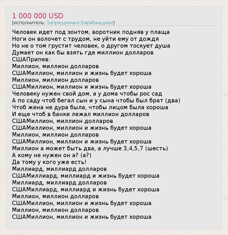 Человек идет под зонтом, воротник подняв у плаща Ноги он волочет с трудом, не уйти ему от дождя Но не о том грустит человек, о другом тоскует душа Думает он как бы взять где миллион долларов СШАПрипев: Миллион, миллион долларов СШАМиллион, миллион и жизнь будет хороша Миллион, миллион долларов СШАМиллион, миллион и жизнь будет хороша Человеку нужен свой дом, а у дома чтобы рос сад А по саду чтоб бегал сын и у сына чтобы был брат (два) Чтоб жена не дура была, чтобы лицом была хороша И еще чтоб в банке лежал миллион долларов СШАМиллион, миллион долларов СШАМиллион, миллион и жизнь будет хороша Миллион, миллион долларов СШАМиллион, миллион и жизнь будет хороша Миллион а может быть два, а лучше 3,4,5,7 (шесть) А кому не нужен он а? (а?) Да тому у кого уже есть! Миллиард, миллиард долларов СШАМиллиард, миллиард и жизнь будет хороша Миллиард, миллиард долларов СШАМиллиард, миллиард и жизнь будет хороша Миллион, миллион долларов СШАМиллион, миллион и жизнь будет хороша Миллион, миллион долларов СШАМиллион, миллион и жизнь будет хороша