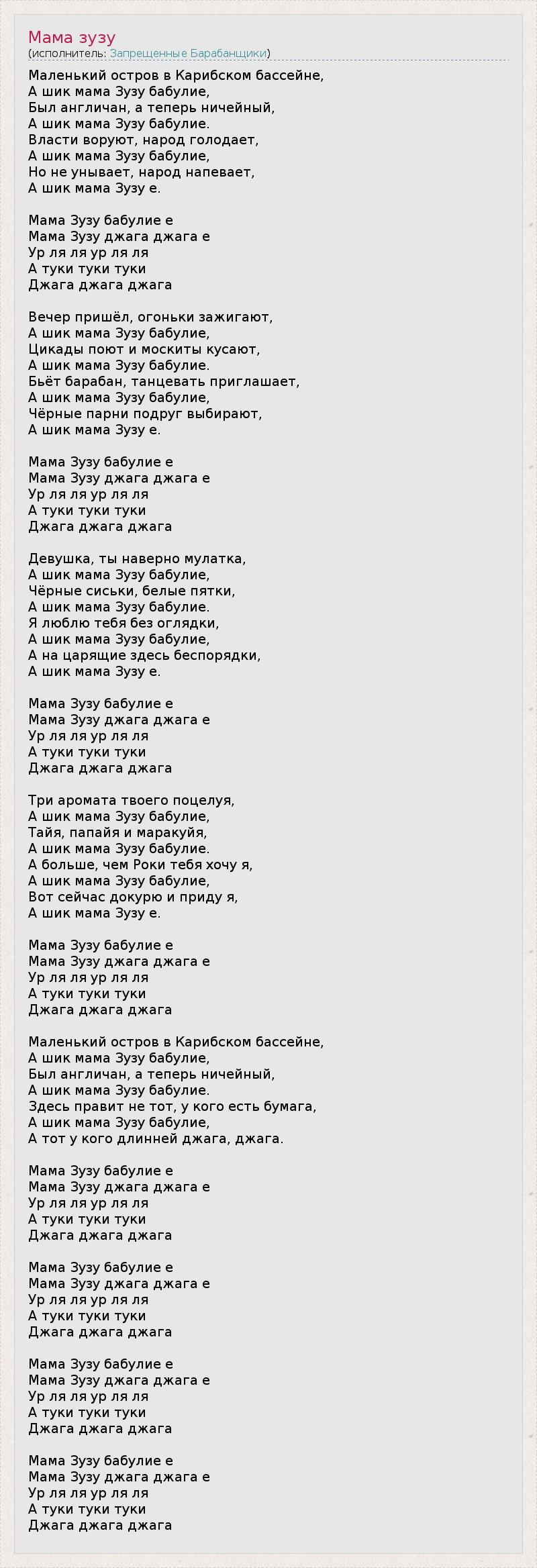 Маленький остров в Карибском бассейне, А шик мама Зузу бабулие, Был англичан, а теперь ничейный, А шик мама Зузу бабулие. Власти воруют, народ голодает, А шик мама Зузу бабулие, Но не унывает, народ напевает, А шик мама Зузу е. Мама Зузу бабулие е Мама Зузу джага джага е Ур ля ля ур ля ля А туки туки туки Джага джага джага Вечер пришёл, огоньки зажигают, А шик мама Зузу бабулие, Цикады поют и москиты кусают, А шик мама Зузу бабулие. Бьёт барабан, танцевать приглашает, А шик мама Зузу бабулие, Чёрные парни подруг выбирают, А шик мама Зузу е. Мама Зузу бабулие е Мама Зузу джага джага е Ур ля ля ур ля ля А туки туки туки Джага джага джага Девушка, ты наверно мулатка, А шик мама Зузу бабулие, Чёрные сиськи, белые пятки, А шик мама Зузу бабулие. Я люблю тебя без оглядки, А шик мама Зузу бабулие, А на царящие здесь беспорядки, А шик мама Зузу е. Мама Зузу бабулие е Мама Зузу джага джага е Ур ля ля ур ля ля А туки туки туки Джага джага джага Три аромата твоего поцелуя, А шик мама Зузу бабулие, Тайя, папайя и маракуйя, А шик мама Зузу бабулие. А больше, чем Роки тебя хочу я, А шик мама Зузу бабулие, Вот сейчас докурю и приду я, А шик мама Зузу е. Мама Зузу бабулие е Мама Зузу джага джага е Ур ля ля ур ля ля А туки туки туки Джага джага джага Маленький остров в Карибском бассейне, А шик мама Зузу бабулие, Был англичан, а теперь ничейный, А шик мама Зузу бабулие. Здесь правит не тот, у кого есть бумага, А шик мама Зузу бабулие, А тот у кого длинней джага, джага. Мама Зузу бабулие е Мама Зузу джага джага е Ур ля ля ур ля ля А туки туки туки Джага джага джага Мама Зузу бабулие е Мама Зузу джага джага е Ур ля ля ур ля ля А туки туки туки Джага джага джага Мама Зузу бабулие е Мама Зузу джага джага е Ур ля ля ур ля ля А туки туки туки Джага джага джага Мама Зузу бабулие е Мама Зузу джага джага е Ур ля ля ур ля ля А туки туки туки Джага джага джага