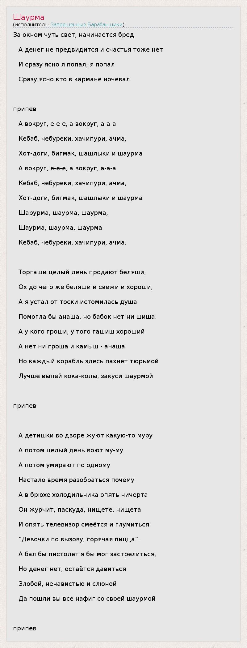 За окном чуть свет, начинается бред А денег не предвидится и счастья тоже нет И сразу ясно я попал, я попал Сразу ясно кто в кармане ночевал припев А вокруг, е-е-е, а вокруг, а-а-а Кебаб, чебуреки, хачипури, ачма, Хот-доги, бигмак, шашлыки и шаурма А вокруг, е-е-е, а вокруг, а-а-а Кебаб, чебуреки, хачипури, ачма, Хот-доги, бигмак, шашлыки и шаурма Шарурма, шаурма, шаурма, Шаурма, шаурма, шаурма Кебаб, чебуреки, хачипури, ачма. Торгаши целый день продают беляши, Ох до чего же беляши и свежи и хороши, А я устал от тоски истомилась душа Помогла бы анаша, но бабок нет ни шиша. А у кого гроши, у того гашиш хороший А нет ни гроша и камыш - анаша Но каждый корабль здесь пахнет тюрьмой Лучше выпей кока-колы, закуси шаурмой припев А детишки во дворе жуют какую-то муру А потом целый день воют му-му А потом умирают по одному Настало время разобраться почему А в брюхе холодильника опять ничерта Он журчит, паскуда, нищете, нищета И опять телевизор смеётся и глумиться: “Девочки по вызову, горячая пицца”. А бал бы пистолет я бы мог застрелиться, Но денег нет, остаётся давиться Злобой, ненавистью и слюной Да пошли вы все нафиг со своей шаурмой припев