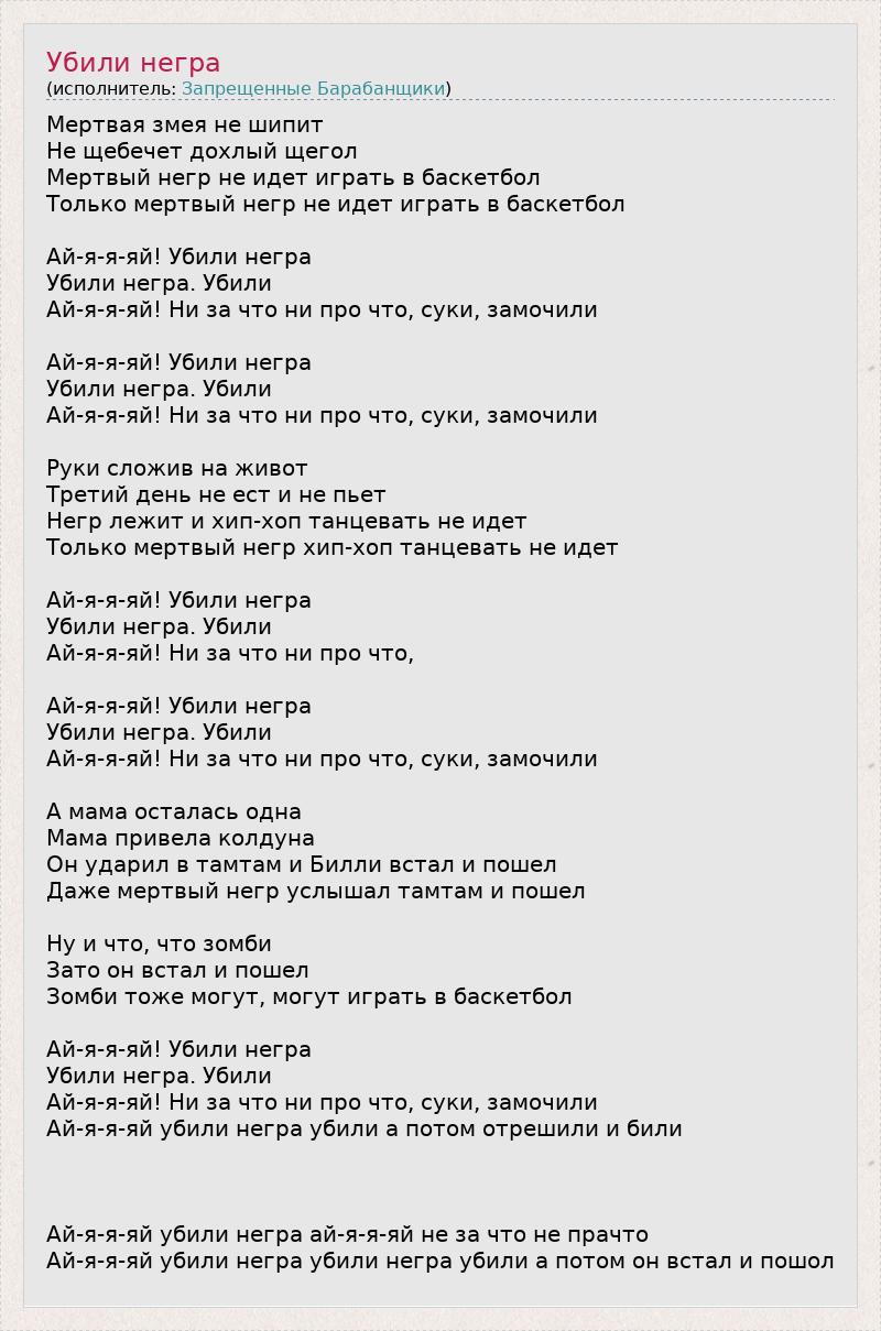 Мертвая змея не шипит Не щебечет дохлый щегол Мертвый негр не идет играть в баскетбол Только мертвый негр не идет играть в баскетбол Ай-я-я-яй! Убили негра Убили негра. Убили Ай-я-я-яй! Ни за что ни про что, суки, замочили Ай-я-я-яй! Убили негра Убили негра. Убили Ай-я-я-яй! Ни за что ни про что, суки, замочили Руки сложив на живот Третий день не ест и не пьет Негр лежит и хип-хоп танцевать не идет Только мертвый негр хип-хоп танцевать не идет Ай-я-я-яй! Убили негра Убили негра. Убили Ай-я-я-яй! Ни за что ни про что, Ай-я-я-яй! Убили негра Убили негра. Убили Ай-я-я-яй! Ни за что ни про что, суки, замочили А мама осталась одна Мама привела колдуна Он ударил в тамтам и Билли встал и пошел Даже мертвый негр услышал тамтам и пошел Ну и что, что зомби Зато он встал и пошел Зомби тоже могут, могут играть в баскетбол Ай-я-я-яй! Убили негра Убили негра. Убили Ай-я-я-яй! Ни за что ни про что, суки, замочили Ай-я-я-яй убили негра убили а потом отрешили и били Ай-я-я-яй убили негра ай-я-я-яй не за что не прачто Ай-я-я-яй убили негра убили негра убили а потом он встал и пошол