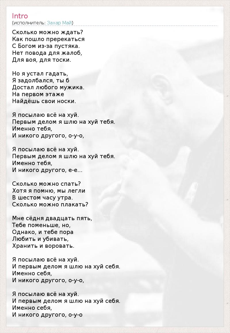 Сколько можно ждать? Как пошло пререкаться С Богом из-за пустяка. Нет повода для жалоб, Для воя, для тоски. Но я устал гадать, Я задолбался, ты б Достал любого мужика. На первом этаже Найдёшь свои носки. Я посылаю всё на хуй. Первым делом я шлю на хуй тебя. Именно тебя, И никого другого, о-у-о, Я посылаю всё на хуй. Первым делом я шлю на хуй тебя. Именно тебя, И никого другого, е-е... Сколько можно спать? Хотя я помню, мы легли В шестом часу утра. Сколько можно плакать? Мне сёдня двадцать пять, Тебе поменьше, но, Однако, и тебе пора Любить и убивать, Хранить и воровать. Я посылаю всё на хуй. И первым делом я шлю на хуй себя. Именно себя, И никого другого, о-у-о, Я посылаю всё на хуй. И первым делом я шлю на хуй себя. Именно себя, И никого другого, о-у-о