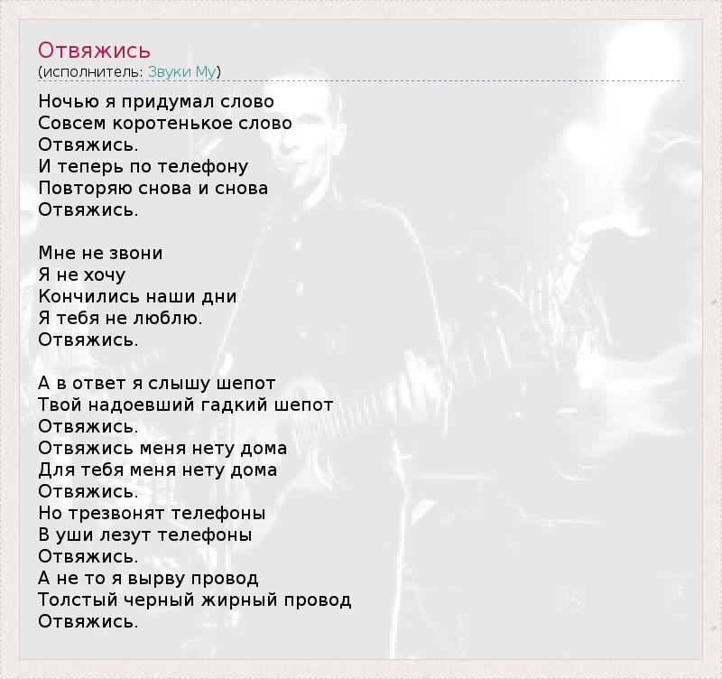 Ночью я придумал слово Совсем коротенькое слово Отвяжись. И теперь по телефону Повторяю снова и снова Отвяжись. Мне не звони Я не хочу Кончились наши дни Я тебя не люблю. Отвяжись. А в ответ я слышу шепот Твой надоевший гадкий шепот Отвяжись. Отвяжись меня нету дома Для тебя меня нету дома Отвяжись. Но трезвонят телефоны В уши лезут телефоны Отвяжись. А не то я вырву провод Толстый черный жирный провод Отвяжись.
