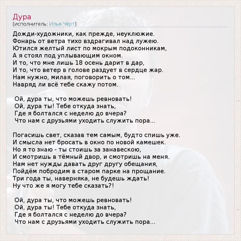 Дожди-художники, как прежде, неуклюжие. Фонарь от ветра тихо вздрагивал над лужею. Ютился желтый лист по мокрым подоконникам, А я стоял под уплывающим окном. И то, что мне лишь 18 осень дарит в дар, И то, что ветер в голове раздует в сердце жар. Нам нужно, милая, поговорить о том... Навряд ли всё тебе скажу потом. Ой, дура ты, что можешь ревновать! Ой, дура ты! Тебе откуда знать, Где я болтался с неделю до вчера? Что нам с друзьями уходить служить пора... Погасишь свет, сказав тем самым, будто спишь уже. И смысла нет бросать в окно по новой камешек. Но я то знаю - ты стоишь за занавескою, И смотришь в тёмный двор, и смотришь на меня. Нам нет нужды давать друг другу обещания, Пойдём побродим в старом парке на прощание. Три года ты, наверняка, не будешь ждать! Ну что же я могу тебе сказать?! Ой, дура ты, что можешь ревновать! Ой, дура ты! Тебе откуда знать, Где я болтался с неделю до вчера? Что нам с друзьями уходить служить пора...