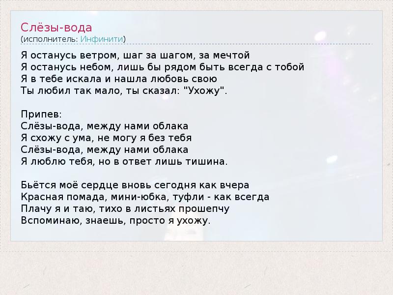 Слезы-вода Слезы-вода Я останусь ветром, Шаг за шагом, за мечтой Я останусь небом, Лишь бы рядом быть всегда с тобой Я в тебе искала И нашла любовь свою Ты любил так мало, Ты сказал: "Ухожу" Припев: Слёзы-вода, между нами облака Я схожу с ума, не могу я без тебя Слёзы-вода, между нами облака Я люблю тебя, но в ответ лишь тишина текст песни(слова) Инфинити Слезы вода найден на сайте www.gl5.ru Слезы-вода Слезы-вода Бьётся моё сердце Dновь сегодня? как вчера Красная помада, Vини-юбка, туфли - как всегда Плачу я и таю, Тихо в листьях прошепчу Вспоминаю, знаешь, Просто я ухожу Припев: Слёзы-вода, между нами облака Я схожу с ума, не могу я без тебя Слёзы-вода, между нами облака Я люблю тебя, но в ответ лишь тишина Слезы-вода Слезы-вода Припев: Слёзы-вода, между нами облака Я схожу с ума, не могу я без тебя Слёзы-вода, между нами облака Я люблю тебя, но в ответ лишь тишина
