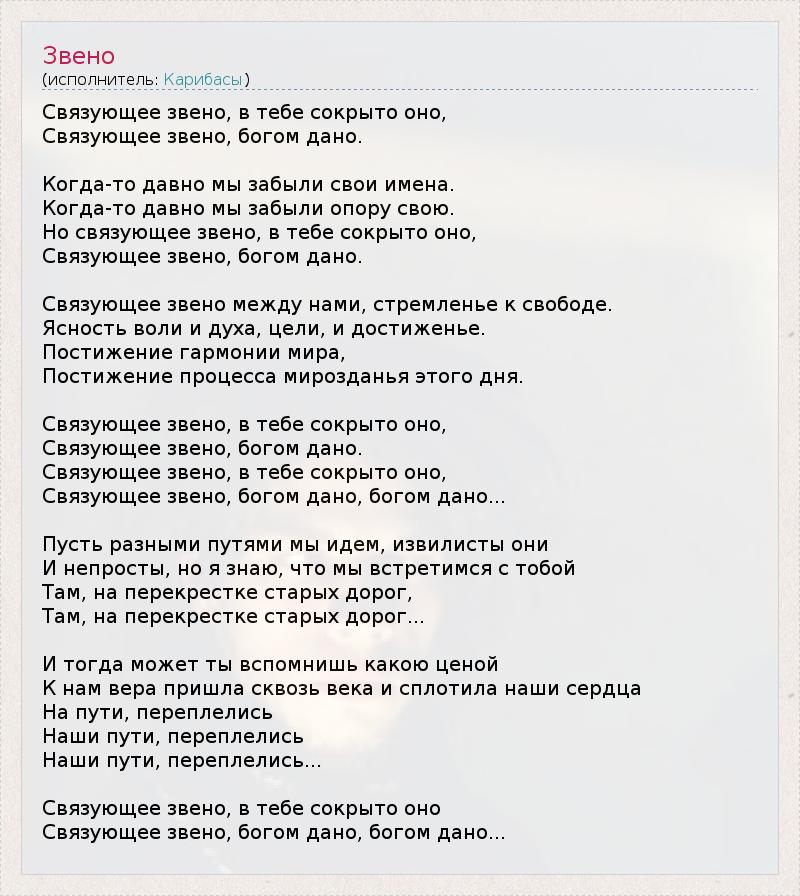 Связующее звено, в тебе сокрыто оно, Связующее звено, богом дано. Когда-то давно мы забыли свои имена. Когда-то давно мы забыли опору свою. Но связующее звено, в тебе сокрыто оно, Связующее звено, богом дано. Связующее звено между нами, стремленье к свободе. Ясность воли и духа, цели, и достиженье. Постижение гармонии мира, Постижение процесса мирозданья этого дня. Связующее звено, в тебе сокрыто оно, Связующее звено, богом дано. Связующее звено, в тебе сокрыто оно, Связующее звено, богом дано, богом дано... Пусть разными путями мы идем, извилисты они И непросты, но я знаю, что мы встретимся с тобой Там, на перекрестке старых дорог, Там, на перекрестке старых дорог... И тогда может ты вспомнишь какою ценой К нам вера пришла сквозь века и сплотила наши сердца На пути, переплелись Наши пути, переплелись Наши пути, переплелись... Связующее звено, в тебе сокрыто оно Связующее звено, богом дано, богом дано...
