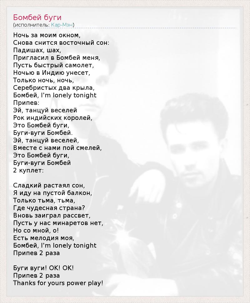 Ночь за моим окном, Снова снится восточный сон: Падишах, шах, Пригласил в Бомбей меня, Пусть быстрый самолет, Ночью в Индию унесет, Только ночь, ночь, Серебристых два крыла, Бомбей, I'm lonely tonight Припев: Эй, танцуй веселей Рок индийских королей, Это Бомбей буги, Буги-вуги Бомбей. Эй, танцуй веселей, Вместе с нами пой смелей, Это Бомбей буги, Буги-вуги Бомбей 2 куплет: Сладкий растаял сон, Я иду на пустой балкон, Только тьма, тьма, Где чудесная страна? Вновь заиграл рассвет, Пусть у нас минаретов нет, Но со мной, о! Есть мелодия моя, Бомбей, I'm lonely tonight Припев 2 раза Буги вуги! OK! OK! Припев 2 раза Thanks for yours power play!