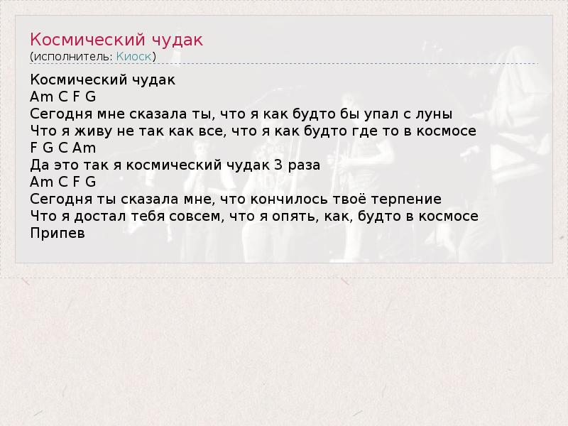 Космический чудак Am C F G Сегодня мне сказала ты, что я как будто бы упал с луны Что я живу не так как все, что я как будто где то в космосе F G C Am Да это так я космический чудак 3 раза Am C F G Сегодня ты сказала мне, что кончилось твоё терпение Что я достал тебя совсем, что я опять, как, будто в космосе Припев