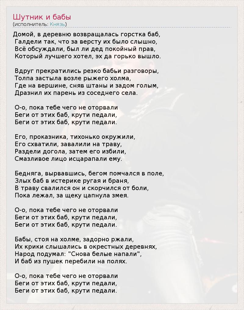 Домой, в деревню возвращалась горстка баб, Галдели так, что за версту их было слышно, Всё обсуждали, был ли дед покойный прав, Который лучшего хотел, эх да горько вышло. Вдруг прекратились резко бабьи разговоры, Толпа застыла возле рыжего холма, Где на вершине, сняв штаны и задом голым, Дразнил их парень из соседнего села. О-о, пока тебе чего не оторвали Беги от этих баб, крути педали, Беги от этих баб, крути педали. Его, проказника, тихонько окружили, Его схватили, завалили на траву, Раздели догола, затем его избили, Смазливое лицо исцарапали ему. Бедняга, вырвавшись, бегом помчался в поле, Злых баб в истерике ругая и браня, В траву свалился он и скорчился от боли, Пока лежал, за щеку цапнула змея. О-о, пока тебе чего не оторвали Беги от этих баб, крути педали, Беги от этих баб, крути педали. Бабы, стоя на холме, задорно ржали, Их крики слышались в окрестных деревнях, Народ подумал: "Снова белые напали", И баб из пушек перебили на полях. О-о, пока тебе чего не оторвали Беги от этих баб, крути педали, Беги от этих баб, крути педали.