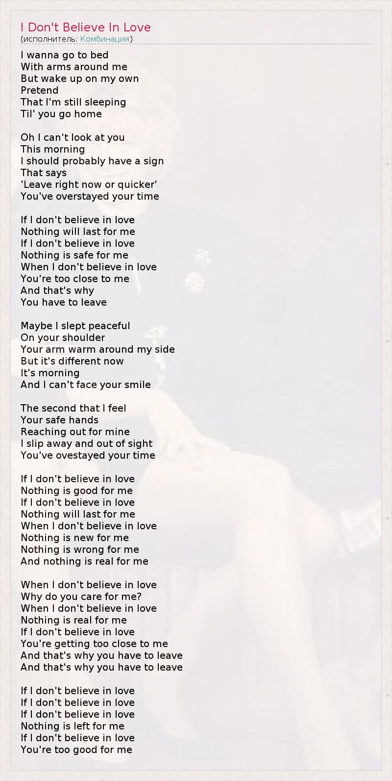 Хочу ложиться спать В твоих объятиях, Но просыпаться в одиночестве, Притворяясь, Что всё ещё сплю, Пока ты не уйдёшь домой. Не могу смотреть на тебя Этим утром. Наверное, должна была увидеть знак, Который значил бы, ‘Уходи, живо’, Твоё время вышло. Если я не верю в любовь, Ничто не будет длиться вечно для меня. Если я не верю в любовь, Ничто не безопасно для меня. Когда не верю в любовь, Ты слишком близко ко мне, И поэтому Тебе нужно уйти. Может, раньше я умиротворённо спала На твоём плече - Твоя рука излучала тепло. Но сейчас всё иначе... Утро, И я не вижу твоей улыбки. Второе, что я чувствую, Твои оберегающие руки, Протянутые к моим. Я ускользаю. Твоё время вышло. Если я не верю в любовь, Нет ничего хорошего для меня Если я не верю в любовь, Ничто не будет длиться вечно для меня. Когда не верю в любовь, Нет ничего нового, Нет ничего неправильного, И нет ничего реального для меня. Когда не верю в любовь, Почему ты всё же заботишься обо мне? Когда не верю в любовь, Нет ничего реального для меня. Если я не верю в любовь, Ты подбираешься ко мне слишком близко… И именно поэтому тебе нужно уйти, Именно поэтому нужно уйти… Если я не верю в любовь, Если не верю в любовь… Если я не верю в любовь, Ничего для меня не осталось. Если не верю в любовь, Ты слишком хорош для меня…