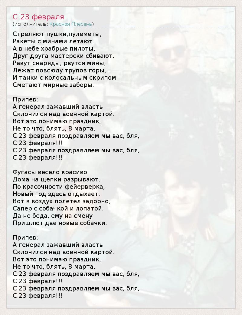 Стреляют пушки,пулеметы, Ракеты с минами летают. А в небе храбрые пилоты, Друг друга мастерски сбивают. Ревут снаряды, рвутся мины, Лежат повсюду трупов горы, И танки с колосальным скрипом Сметают мирные заборы. Припев: А генерал зажавший власть Склонился над военной картой. Вот это понимаю праздник, Не то что, блять, 8 марта. С 23 февраля поздравляем мы вас, бля, С 23 февраля!!! С 23 февраля поздравляем мы вас, бля, С 23 февраля!!! Фугасы весело красиво Дома на щепки разрывают. По красочности фейерверка, Новый год здесь отдыхает. Вот в воздух полетел задорно, Сапер с собачкой и лопатой. Да не беда, ему на смену Пришлют две новые собачки. Припев: А генерал зажавший власть Склонился над военной картой. Вот это понимаю праздник, Не то что, блять, 8 марта. С 23 февраля поздравляем мы вас, бля, С 23 февраля!!! С 23 февраля поздравляем мы вас, бля, С 23 февраля!!!