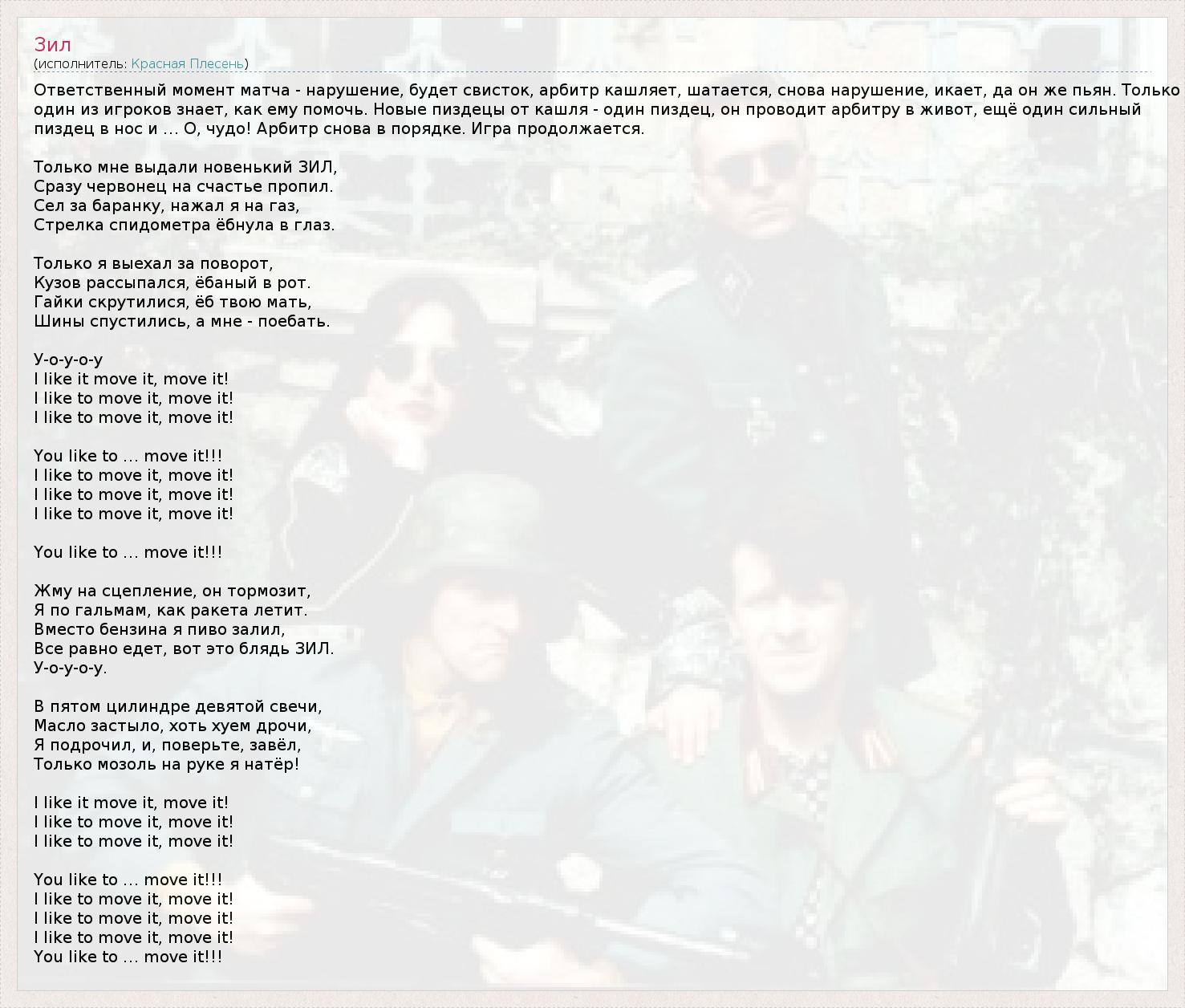Ответственный момент матча - нарушение, будет свисток, арбитр кашляет, шатается, снова нарушение, икает, да он же пьян. Только один из игроков знает, как ему помочь. Новые пиздецы от кашля - один пиздец, он проводит арбитру в живот, ещё один сильный пиздец в нос и … О, чудо! Арбитр снова в порядке. Игра продолжается. Только мне выдали новенький ЗИЛ, Сразу червонец на счастье пропил. Сел за баранку, нажал я на газ, Стрелка спидометра ёбнула в глаз. Только я выехал за поворот, Кузов рассыпался, ёбаный в рот. Гайки скрутилися, ёб твою мать, Шины спустились, а мне - поебать. У-о-у-о-у I like it move it, move it! I like to move it, move it! I like to move it, move it! You like to … move it!!! I like to move it, move it! I like to move it, move it! I like to move it, move it! You like to … move it!!! Жму на сцепление, он тормозит, Я по гальмам, как ракета летит. Вместо бензина я пиво залил, Все равно едет, вот это блядь ЗИЛ. У-о-у-о-у. В пятом цилиндре девятой свечи, Масло застыло, хоть хуем дрочи, Я подрочил, и, поверьте, завёл, Только мозоль на руке я натёр! I like it move it, move it! I like to move it, move it! I like to move it, move it! You like to … move it!!! I like to move it, move it! I like to move it, move it! I like to move it, move it! You like to … move it!!!