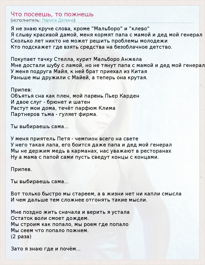 ГлавнаяИсполнителиЛариса ДолинаЧто посеешь, то пожнешь