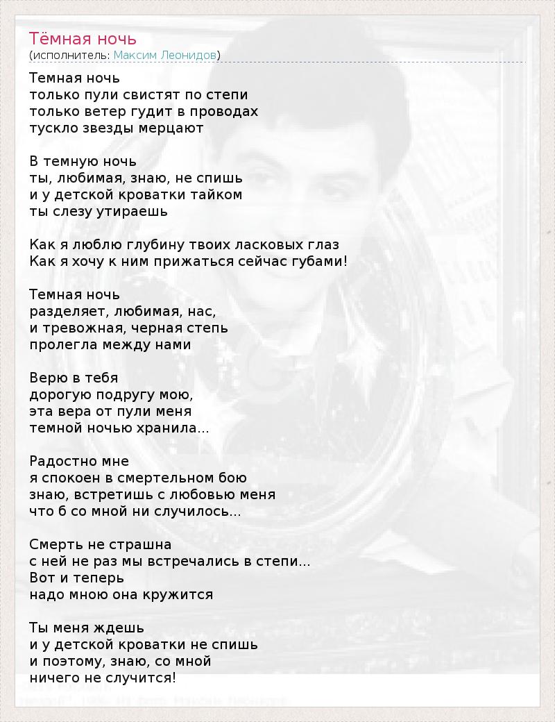 Темная ночь только пули свистят по степи только ветер гудит в проводах тускло звезды мерцают В темную ночь ты, любимая, знаю, не спишь и у детской кроватки тайком ты слезу утираешь Как я люблю глубину твоих ласковых глаз Как я хочу к ним прижаться сейчас губами! Темная ночь разделяет, любимая, нас, и тревожная, черная степь пролегла между нами Верю в тебя дорогую подругу мою, эта вера от пули меня темной ночью хранила... Радостно мне я спокоен в смертельном бою знаю, встретишь с любовью меня что б со мной ни случилось... Смерть не страшна с ней не раз мы встречались в степи... Вот и теперь надо мною она кружится Ты меня ждешь и у детской кроватки не спишь и поэтому, знаю, со мной ничего не случится!