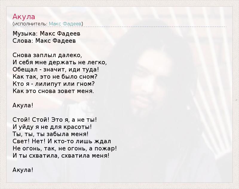 Музыка: Макс Фадеев Слова: Макс Фадеев Снова заплыл далеко, И себя мне держать не легко, Обещал - значит, иди туда! Как так, это не было сном? Кто я - лилипут или гном? Как это снова зовет меня. Акула! Стой! Стой! Это я, а не ты! И уйду я не для красоты! Ты, ты, ты забыла меня! Свет! Нет! И кто-то лишь ждал Не огонь, так, не огонь, а пожар! И ты схватила, схватила меня! Акула!