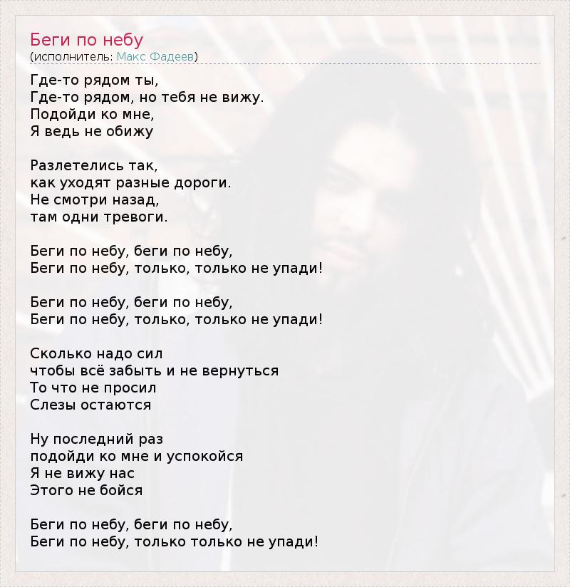 Где-то рядом ты, Где-то рядом, но тебя не вижу. Подойди ко мне, Я ведь не обижу Разлетелись так, как уходят разные дороги. Не смотри назад, там одни тревоги. Беги по небу, беги по небу, Беги по небу, только, только не упади! Беги по небу, беги по небу, Беги по небу, только, только не упади! Сколько надо сил чтобы всё забыть и не вернуться То что не просил Слезы остаются Ну последний раз подойди ко мне и успокойся Я не вижу нас Этого не бойся Беги по небу, беги по небу, Беги по небу, только только не упади!