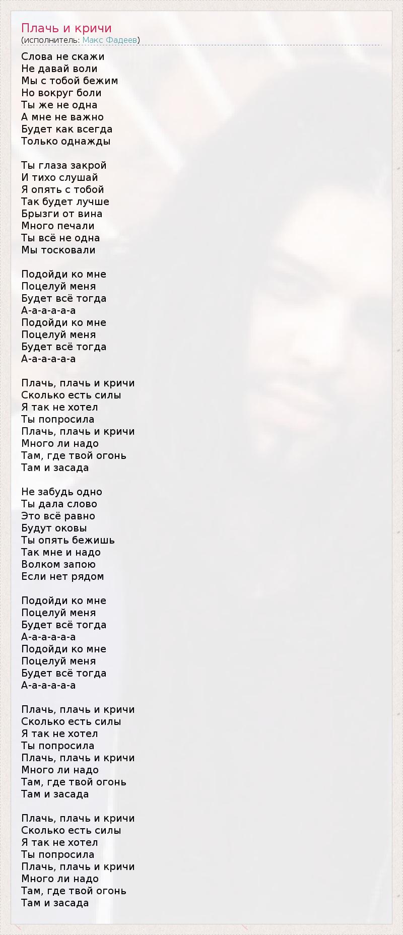 Слова не скажи Не давай воли Мы с тобой бежим Но вокруг боли Ты же не одна А мне не важно Будет как всегда Только однажды Ты глаза закрой И тихо слушай Я опять с тобой Так будет лучше Брызги от вина Много печали Ты всё не одна Мы тосковали Подойди ко мне Поцелуй меня Будет всё тогда А-а-а-а-а-а Подойди ко мне Поцелуй меня Будет всё тогда А-а-а-а-а-а Плачь, плачь и кричи Сколько есть силы Я так не хотел Ты попросила Плачь, плачь и кричи Много ли надо Там, где твой огонь Там и засада Не забудь одно Ты дала слово Это всё равно Будут оковы Ты опять бежишь Так мне и надо Волком запою Если нет рядом Подойди ко мне Поцелуй меня Будет всё тогда А-а-а-а-а-а Подойди ко мне Поцелуй меня Будет всё тогда А-а-а-а-а-а Плачь, плачь и кричи Сколько есть силы Я так не хотел Ты попросила Плачь, плачь и кричи Много ли надо Там, где твой огонь Там и засада Плачь, плачь и кричи Сколько есть силы Я так не хотел Ты попросила Плачь, плачь и кричи Много ли надо Там, где твой огонь Там и засада