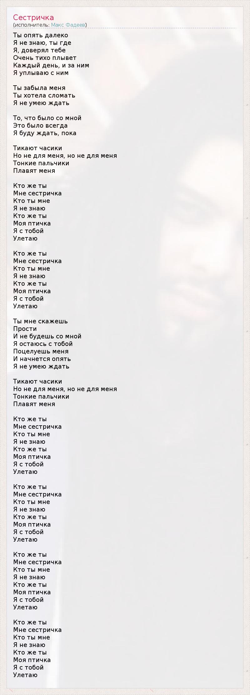 Ты опять далеко Я не знаю, ты где Я, доверял тебе Очень тихо плывет Каждый день, и за ним Я уплываю с ним Ты забыла меня Ты хотела сломать Я не умею ждать То, что было со мной Это было всегда Я буду ждать, пока Тикают часики Но не для меня, но не для меня Тонкие пальчики Плавят меня Кто же ты Мне сестричка Кто ты мне Я не знаю Кто же ты Моя птичка Я с тобой Улетаю Кто же ты Мне сестричка Кто ты мне Я не знаю Кто же ты Моя птичка Я с тобой Улетаю Ты мне скажешь Прости И не будешь со мной Я остаюсь с тобой Поцелуешь меня И начнется опять Я не умею ждать Тикают часики Но не для меня, но не для меня Тонкие пальчики Плавят меня Кто же ты Мне сестричка Кто ты мне Я не знаю Кто же ты Моя птичка Я с тобой Улетаю Кто же ты Мне сестричка Кто ты мне Я не знаю Кто же ты Моя птичка Я с тобой Улетаю Кто же ты Мне сестричка Кто ты мне Я не знаю Кто же ты Моя птичка Я с тобой Улетаю Кто же ты Мне сестричка Кто ты мне Я не знаю Кто же ты Моя птичка Я с тобой Улетаю