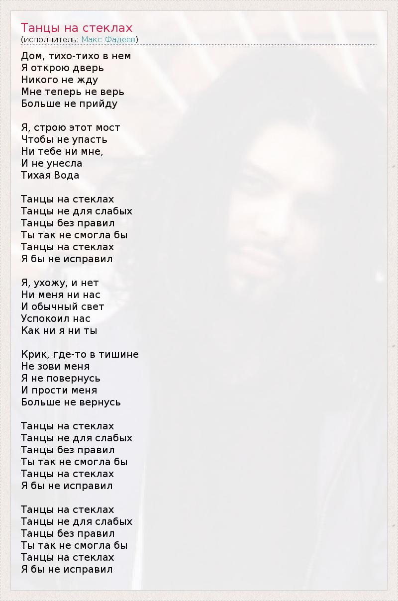 Дом, тихо-тихо в нем Я открою дверь Никого не жду Мне теперь не верь Больше не прийду Я, строю этот мост Чтобы не упасть Ни тебе ни мне, И не унесла Тихая Вода Танцы на стеклах Танцы не для слабых Танцы без правил Ты так не смогла бы Танцы на стеклах Я бы не исправил Я, ухожу, и нет Ни меня ни нас И обычный свет Успокоил нас Как ни я ни ты Крик, где-то в тишине Не зови меня Я не повернусь И прости меня Больше не вернусь Танцы на стеклах Танцы не для слабых Танцы без правил Ты так не смогла бы Танцы на стеклах Я бы не исправил Танцы на стеклах Танцы не для слабых Танцы без правил Ты так не смогла бы Танцы на стеклах Я бы не исправил