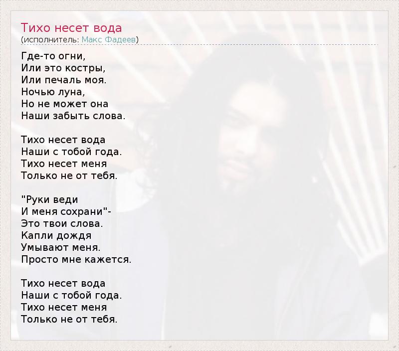 Где-то огни, Или это костры, Или печаль моя. Ночью луна, Но не может она Наши забыть слова. Тихо несет вода Наши с тобой года. Тихо несет меня Только не от тебя. "Руки веди И меня сохрани"- Это твои слова. Капли дождя Умывают меня. Просто мне кажется. Тихо несет вода Наши с тобой года. Тихо несет меня Только не от тебя.