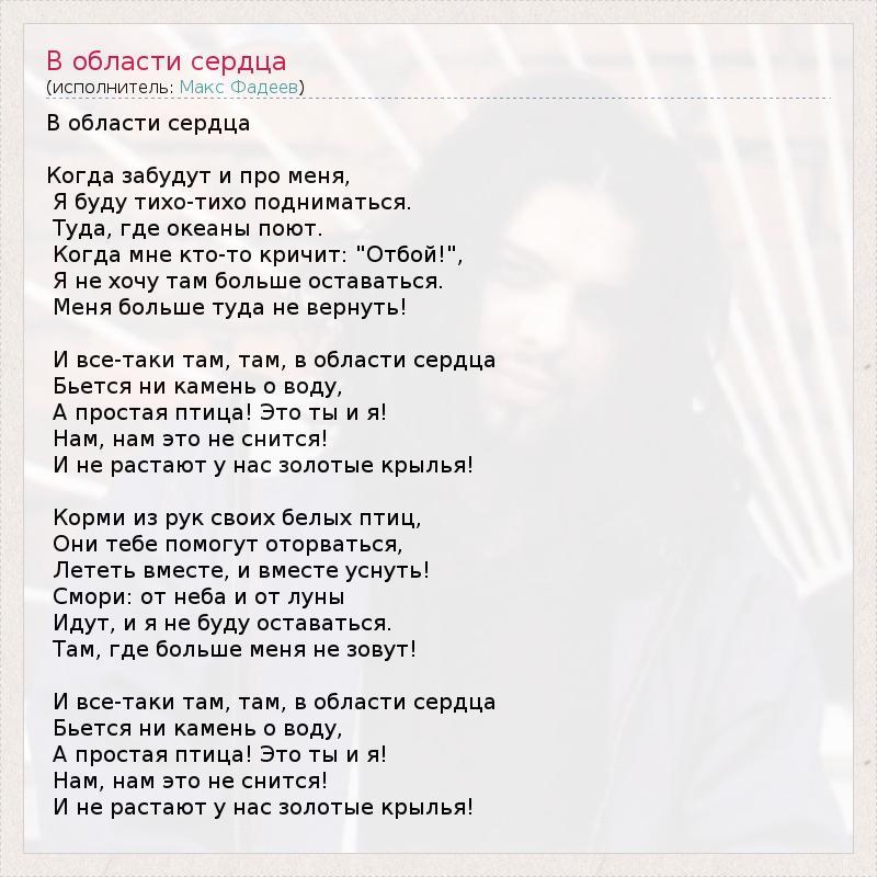 В области сердца Когда забудут и про меня, Я буду тихо-тихо подниматься. Туда, где океаны поют. Когда мне кто-то кричит: "Отбой!", Я не хочу там больше оставаться. Меня больше туда не вернуть! И все-таки там, там, в области сердца Бьется ни камень о воду, А простая птица! Это ты и я! Нам, нам это не снится! И не растают у нас золотые крылья! Корми из рук своих белых птиц, Они тебе помогут оторваться, Лететь вместе, и вместе уснуть! Смори: от неба и от луны Идут, и я не буду оставаться. Там, где больше меня не зовут! И все-таки там, там, в области сердца Бьется ни камень о воду, А простая птица! Это ты и я! Нам, нам это не снится! И не растают у нас золотые крылья!